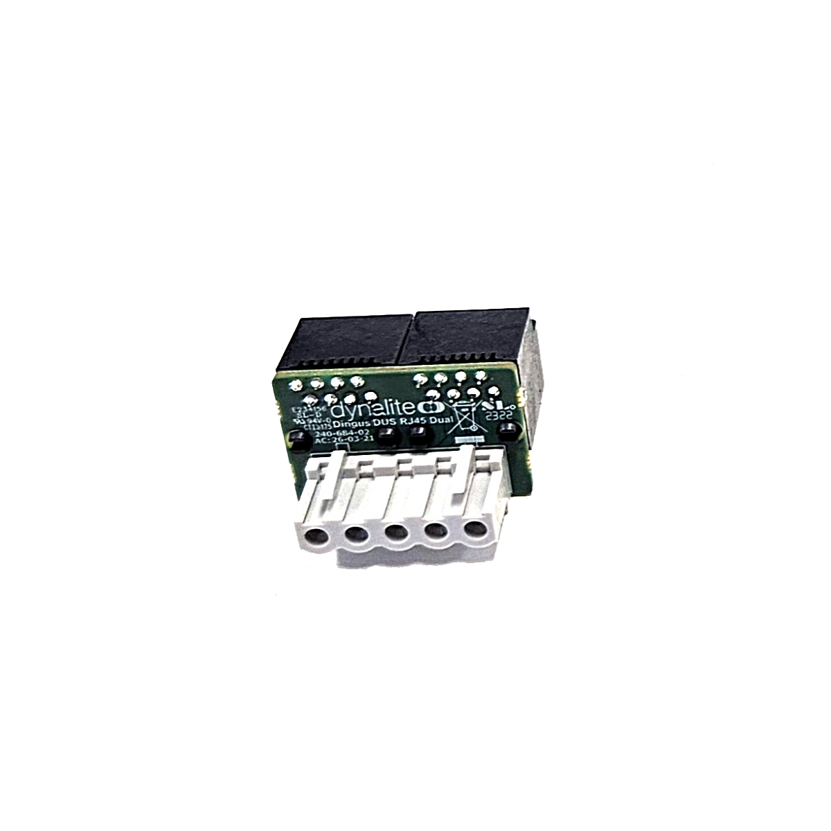 5-way plug with 2 x RJ45 socket (side entry facing left) to connect to DCM-DyNet module in the DMC2 and DMC4 load controllers.