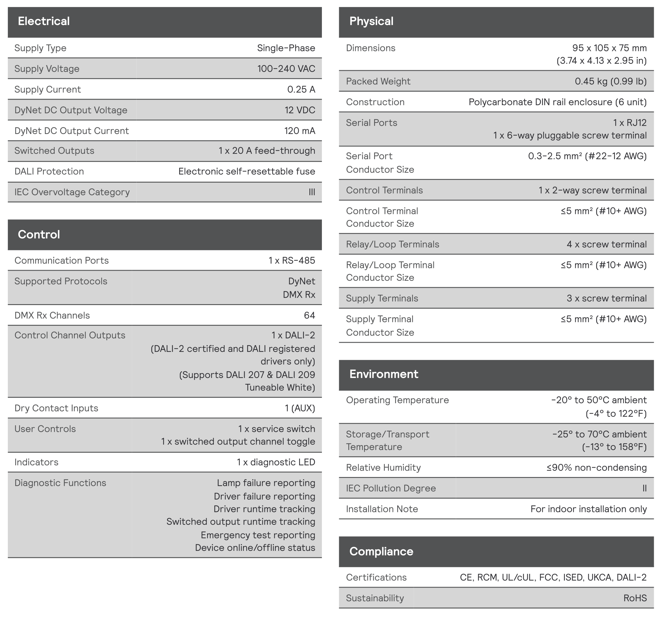 Compatible with a range of DALI fittings and devices, including DALI fluorescent drivers, DALI electronic low voltage transformers, DALI LED fixtures, DALI emergency lighting fixtures and Philips Dynalite DALI sensors and user interfaces.